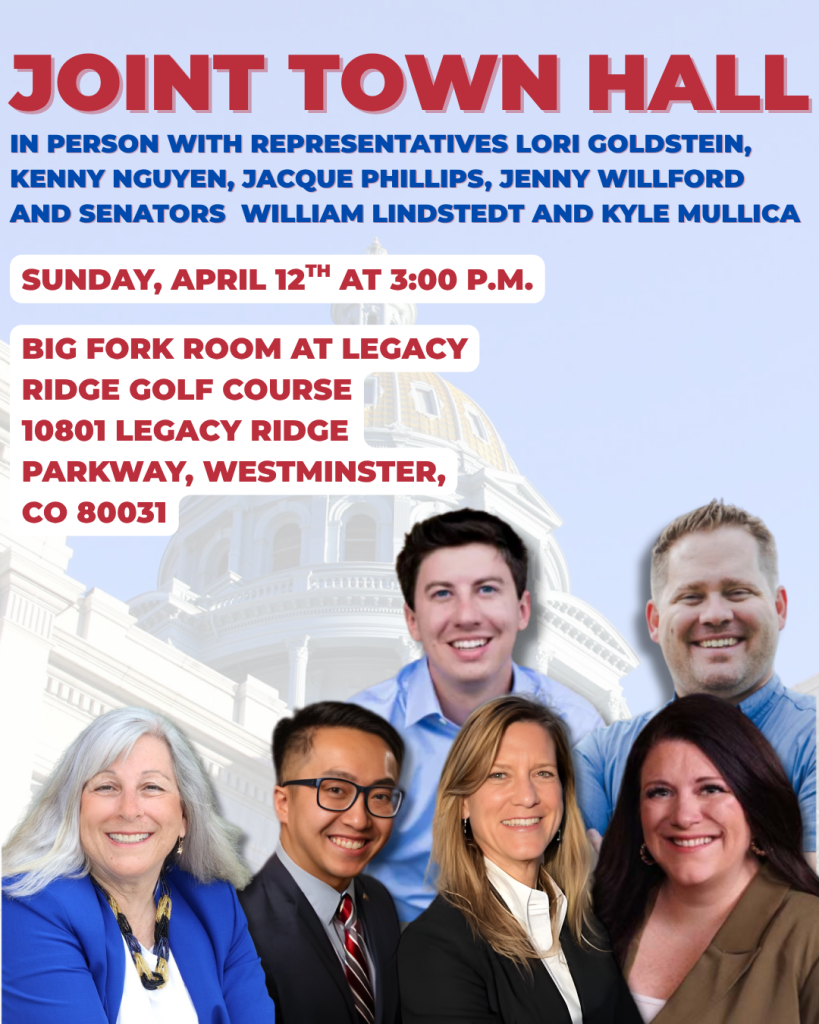 HD 29 Representative Lori Goldestein is hosting a joint town hall on Sunday, April 12th at 3:00 PM. The event will be held in the Big Fork Room at Legacy Ridge Golf Course (10801 Legacy Ridge Parkway, Westminster, CO 80031). We look forward to seeing you there.